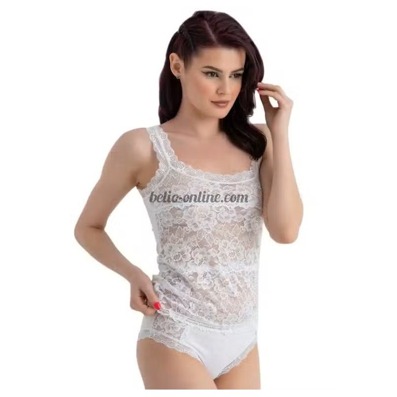 Дамски комплект от корсаж изцяло дантелен отпред и плътен гръб от памук/ликра, с дантелена презрамка и класическа бикина с дантела отстрани.