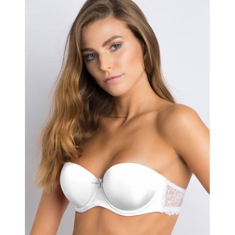 Бриджитка от сатениран микрофибър, без подплънки, регулируеми и свалящи се презрамки, дантелен колан с двойни силиконови ленти за по-добра устойчивост и възможност да се носи и без презрамки при по-разголени тоалети.